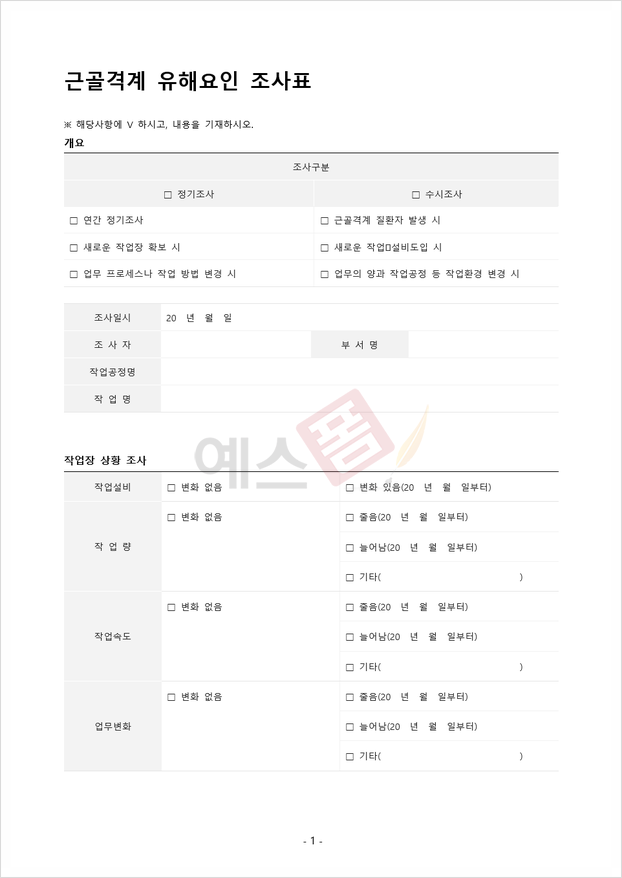 오늘 알아본 산업안전보건법감독대상, 산업안전보건법과태료 등의 관련 정보와 예스폼 산업안전보건법양식이 안전한 작업환경을 조성하는 데에 도움이 되셨길 바랍니다. 예스폼에서는 보다 다양한 산업안전보건법양식을 제공하고 있으니 관련 서식을 찾으신다면 참고해 보시기 바랍니다.