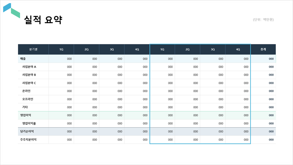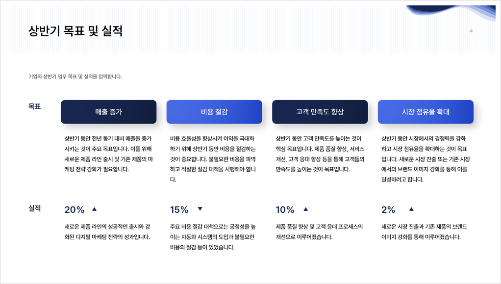 기업 상반기 실적보고서는 1월부터 6월까지의 경영 성과를 종합적으로 평가하는 문서예요. 상반기 실적보고서는 매출, 이익, 비용, 시장 점유율 등 다양한 지표를 통해 회사의 현재 상태를 파악할 수 있는데요. 상반기 동안 이루어진 주요 프로젝트와 전략적 결정에 대한 상세한 분석을 통해 기업은 문제점 및 개선 방안을 파악하고 하반기 목표를 세울 수 있어요.