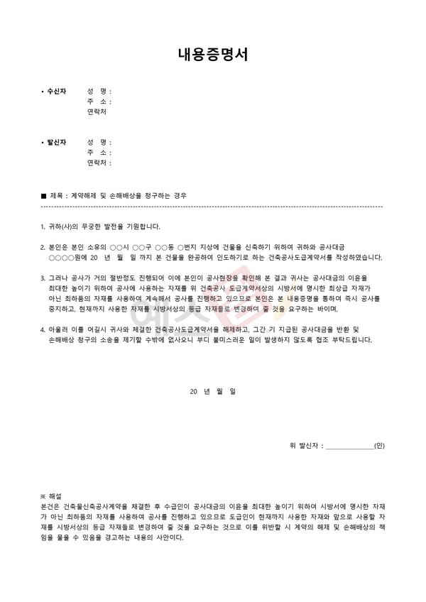 | 내용증명서 (계약파기 고지) | 내용증명서 (계약이행 촉구 및 해제 통보) | 내용증명 (계약해제 및 손해배상 청구) |