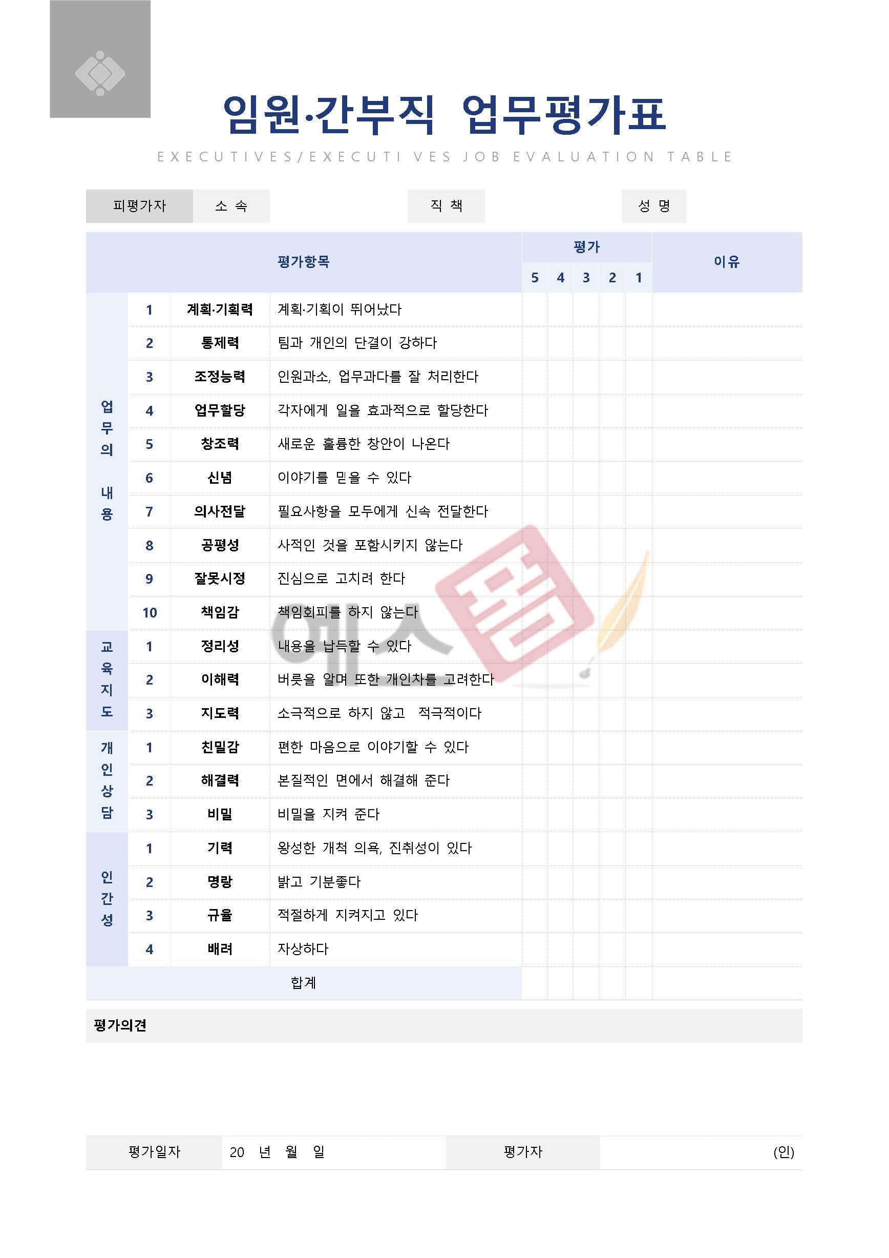 | 임원 간부직 업무평가표 | [2023년] 상사 인사고과표 | [2023년] 관리직 인사고과표(평가등급) |