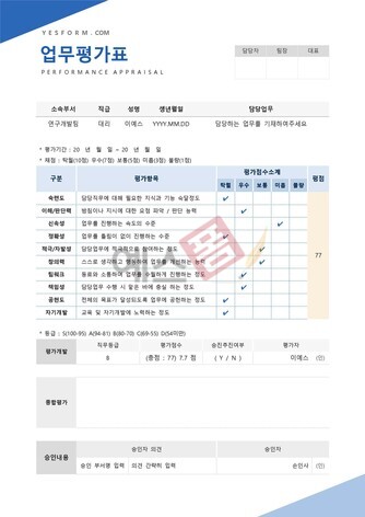 본인의 업무평가를 할 때는 항상 긍정적인 자세가 중요하며 장점을 지나치게 강조하는 것은 좋은 결과로 이어질 수 없습니다. 또한 승진 기회, 업무성과 과시를 위해 거짓 내용을 작성하거나 다른 직원을 깎아내리는 등의 내용은 피해 주시기 바라며 저희 예스폼에서 제공드리는 업무 평가표의 양식을 토대로 업무평가를 진행하시면 보다 편리하고 빠르게 작성하실 수 있을 거라 생각합니다.