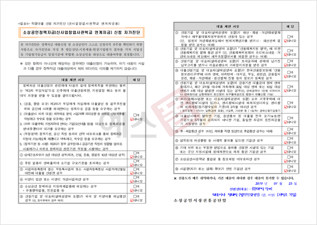 직접 대출 신청 자가 진단은 정책 자금 대출 신청 전 소상공인이 스스로 신청 자격 유무를 확인하기 위한 사항으로 자가 진단표 작성 후 방문상담, 서류 제출, 현장 기업평가 절차를 거쳐 사업성 등 기업평가등급이 일정 기준에 부합한 소상공인을 대상으로 대출 여부를 결정합니다.