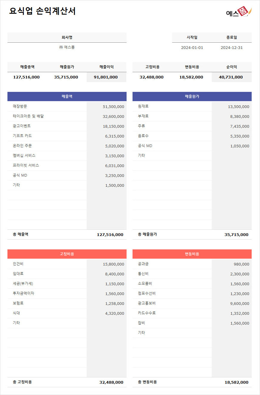 손익 예산서 요식업 손익계산서 자영업 손익계산서