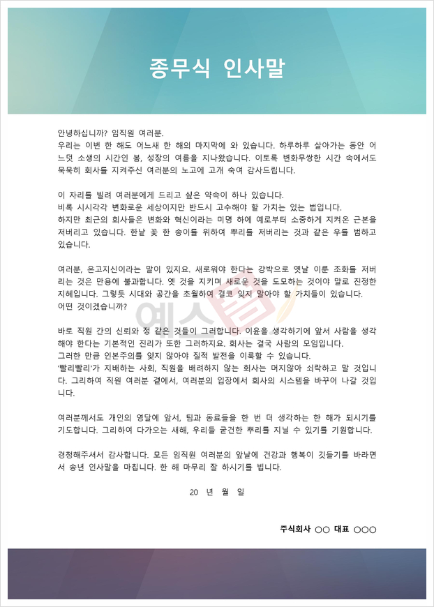 | [송년사] 종무식 인사말 (소통, 열정) | [송년사] 종무식 인사말 (변화, 신뢰) | 송년회 인사말 |