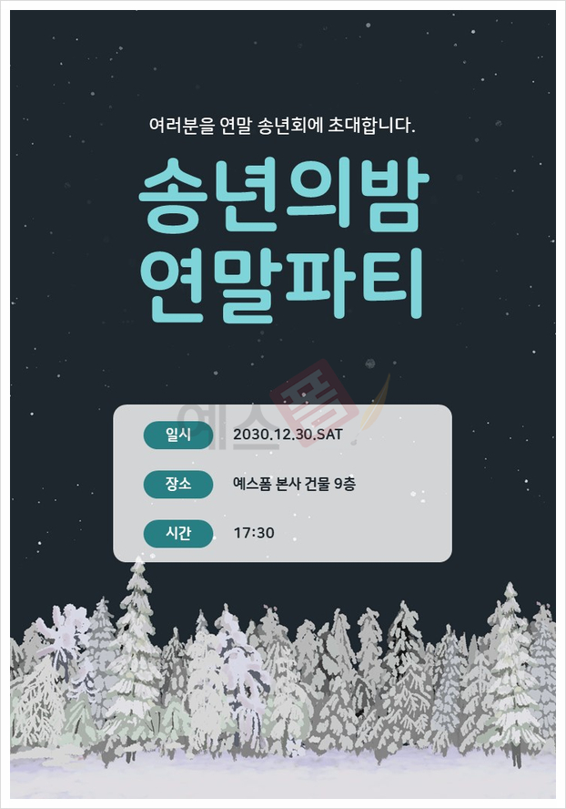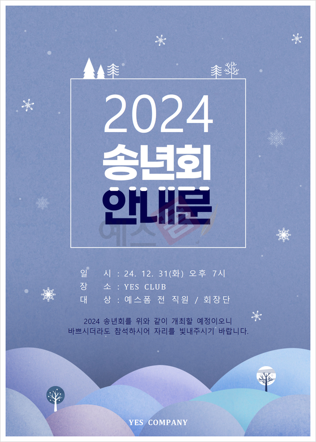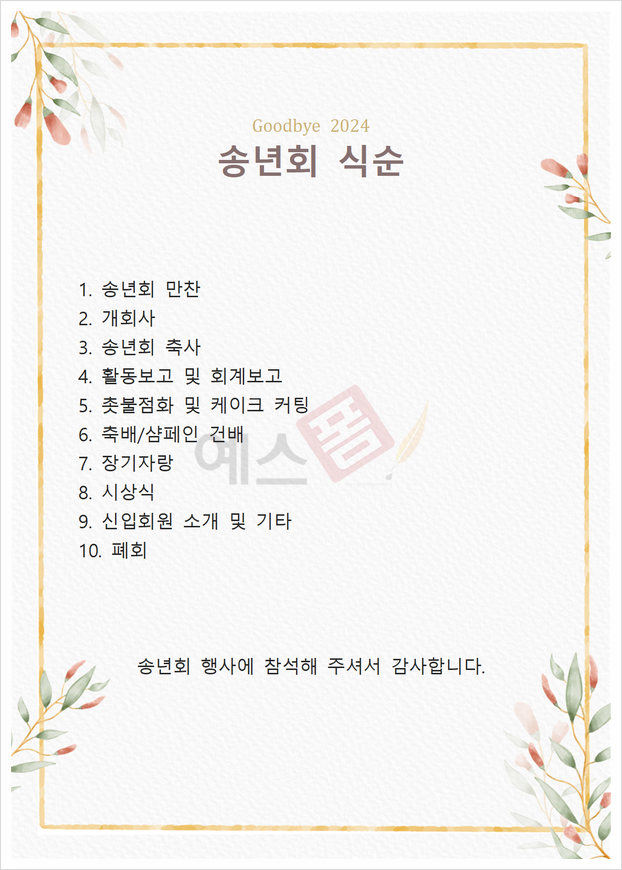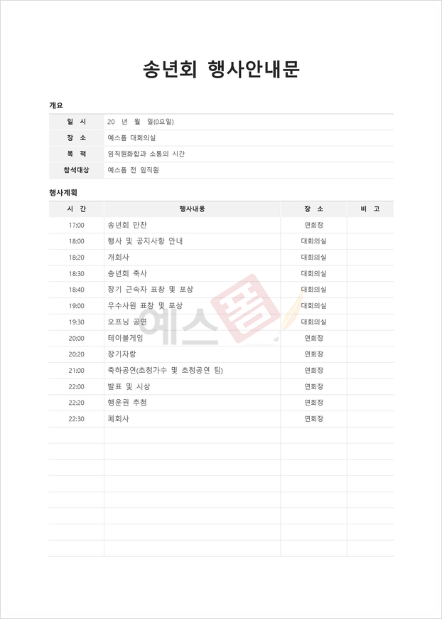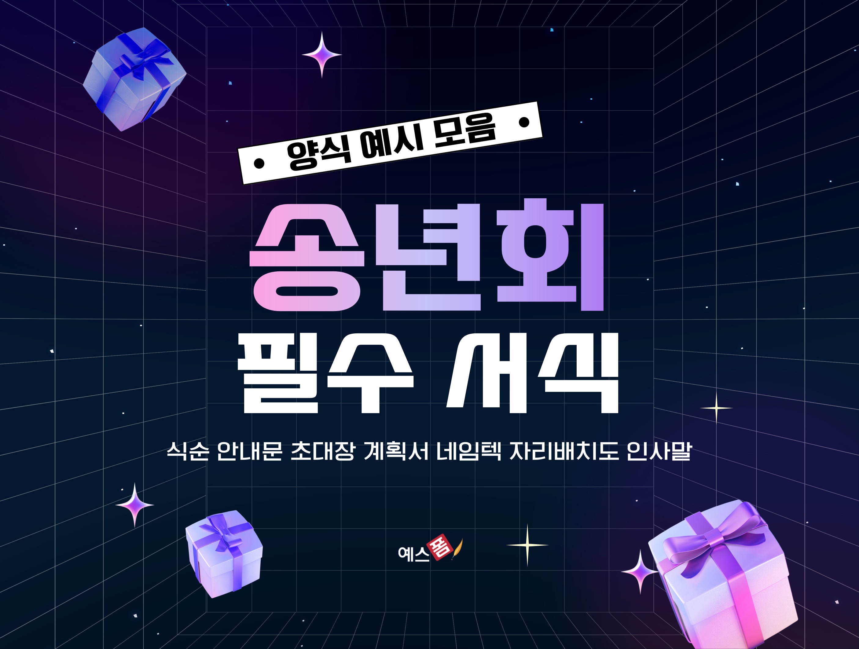 오늘은 예스폼에서 만나보실 수 있는 송년회 식순, 송년회 안내문, 송년회 인사말 양식 및 예시를 소개드릴 예정입니다. 송년의 밤 연말행사, 기업 송년회를 준비하는데 도움 되는 양식 및 예시로 회사연말행사 준비를 위해 연말행사 안내문, 연말파티초대장 등을 찾으셨다면 오늘 포스팅 참고해 보시기 바랍니다.