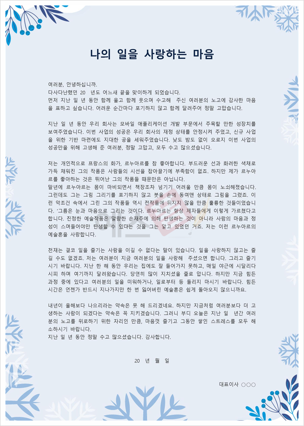 | [송년사] 사장 송년회 인사말(감사) | [송년사] 직원대표 송년회 인사말 | [송년사] 종무식 인사말 (야근, 발전) |