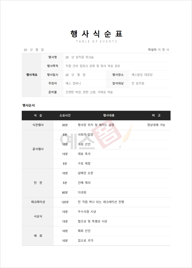 송년회 식순 종무식 식순을 작성할 때 예상보다 행사가 길어질 수 있으니 각 프로그램별 시간을 여유 있게 배분하는 것이 중요합니다. 송년행사 식순과 송년회행사계획서를 함께 작성하면 행사 진행 시 혼란을 줄이고 원활한 진행을 도울 수 있습니다. 캐주얼한 분위기의 사내 연말 행사, 송년행사인 경우 송년의 밤 콘셉트를 활용한 게임이나 시상식을 추가하면 더욱 풍성한 분위기를 연출할 수 있습니다. 퀴즈나 경품 추첨 같은 참여형 프로그램은 분위기를 더욱 활기차게 만들 수 있습니다.