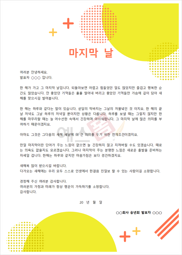또한 송년회에서 느꼈던 감동과 결심을 이어받아, 다가오는 신년회나 시무식을 통해 새로운 도약을 준비해 보는 것도 좋습니다. 다가올 새해는 어떤 목표를 이루고 싶으신가요? 연말 송년회의 의미를 되새기며 다가올 한 해가 더 나은 시간이 되도록 준비해 보세요. 예스폼에서는 보다 다양한 송년회 양식, 종무식 양식, 시무식 양식을 제공하고 있으니 관련 양식 예시를 찾으신다면 참고해 보시기를 바랍니다. 연말을 맞아 함께한 모든 순간이 감사하고, 새해에는 더 큰 행복과 성공이 여러분을 기다리고 있기를 바랍니다.