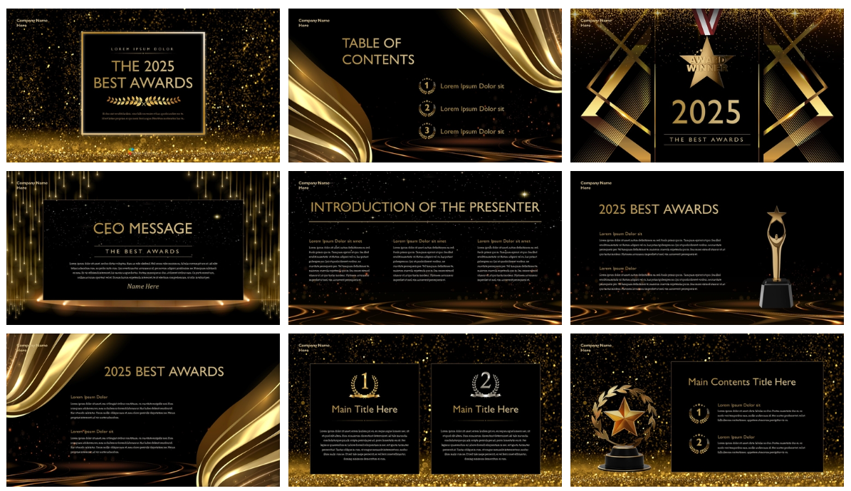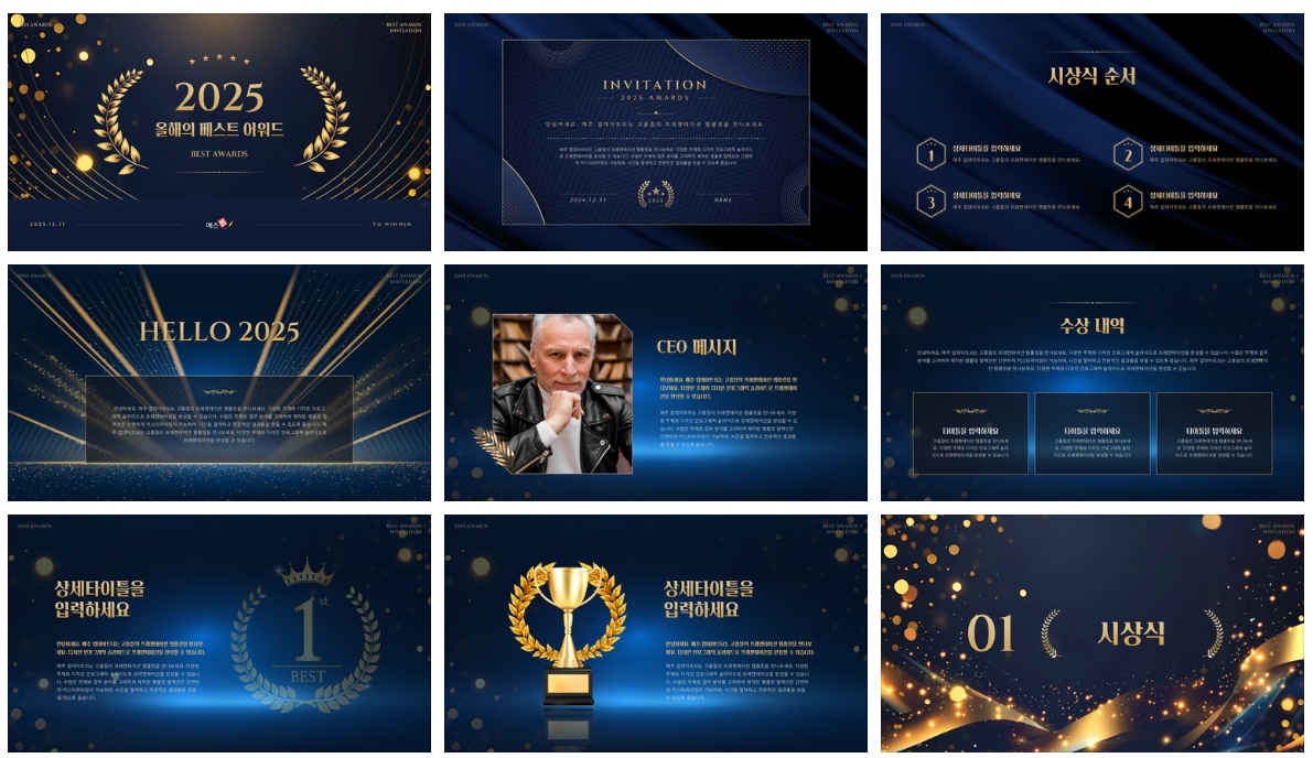 어느덧 2024년이 마무리되는 시점입니다. 한 해 동안의 노력과 성과를 되돌아보고 다가오는 2025년을 설레는 마음으로 준비할 때가 되었는데요. 연말 기업과 조직에서는 한 해를 마무리하며 소중한 순간을 함께 나눌 수 있는 연말 파티 시상식 송년회 등과 같은 기념행사를 준비하곤 합니다. 직원들의 노고를 격려하고 조직의 비전을 공유하는 자리로 뜻깊은 기업 행사 중 하나인데요. 이런 연말 시상식을 성공적으로 준비하기 위해서는 발표 자료 또한 눈길을 사로잡을 수 있도록 잘 제작되어야 합니다. 깔끔한 PPT 템플릿은 분위기를 살리고 메시지를 전달하기 때문입니다.