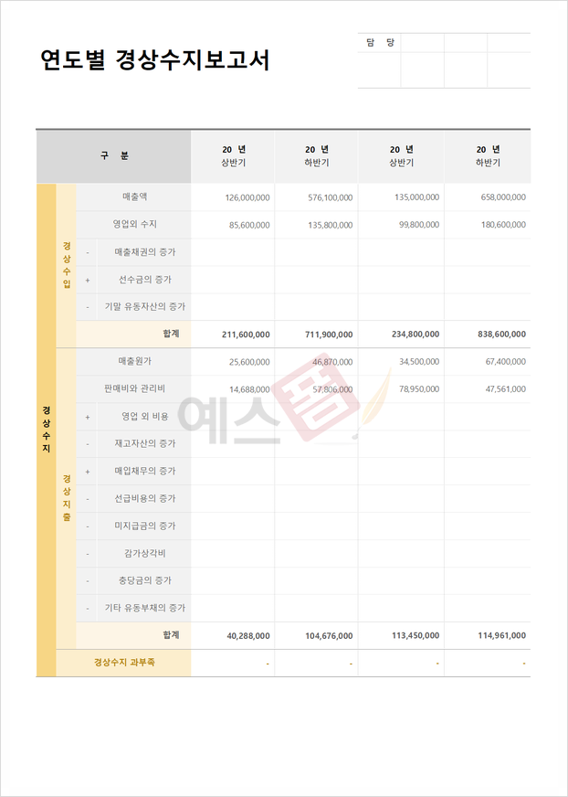 상반기와 하반기별로 경상수입과 경상지출을 나타낸 연도별 경상수지보고서 양식 및 예시입니다. 경상수입에는 매출액, 영업 외 수지, 매출채권의 증가 등이 포함되어 있습니다. 이를 통해 기업이나 조직이 경영 성과를 평가하고 재무 상태를 파악하는 데에 중요한 정보를 제공할 수 있습니다.