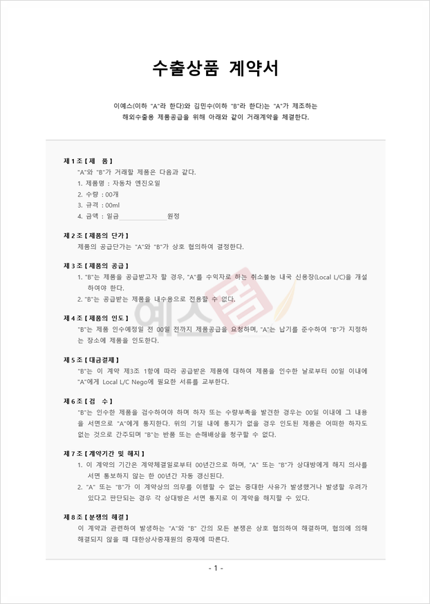 다양한 문서서식을 한 눈에!! '수출 계약서' 국내 1위 문서서식 플랫폼 예스폼 통합검색의 결과 입니다. 계약서, PPT, 사업계획서, 회사문서, 엑셀 프로그램등 다양한 문서서식을 경험해 보세요.