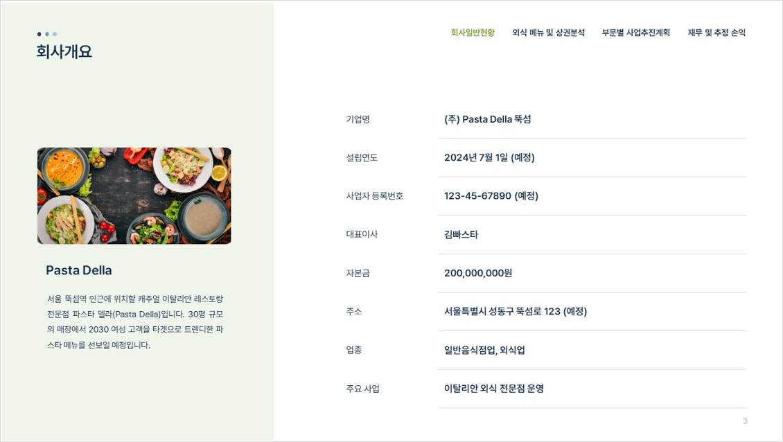 이탈리안 레스토랑 창업 사업계획서 (피자 파스타 전문점)에 대해 자료입니다. 이탈리안 레스토랑 창업에 관한 샘플을 생성형AI 기술을 활용하여 예시로 제작된 샘플 예제이며 실제 파스타 창업에 도움되는 목차와 템플릿으로 구성되어 있어 사업 및 정책자금 용도로 적용하기에 유용한 자료입니다.