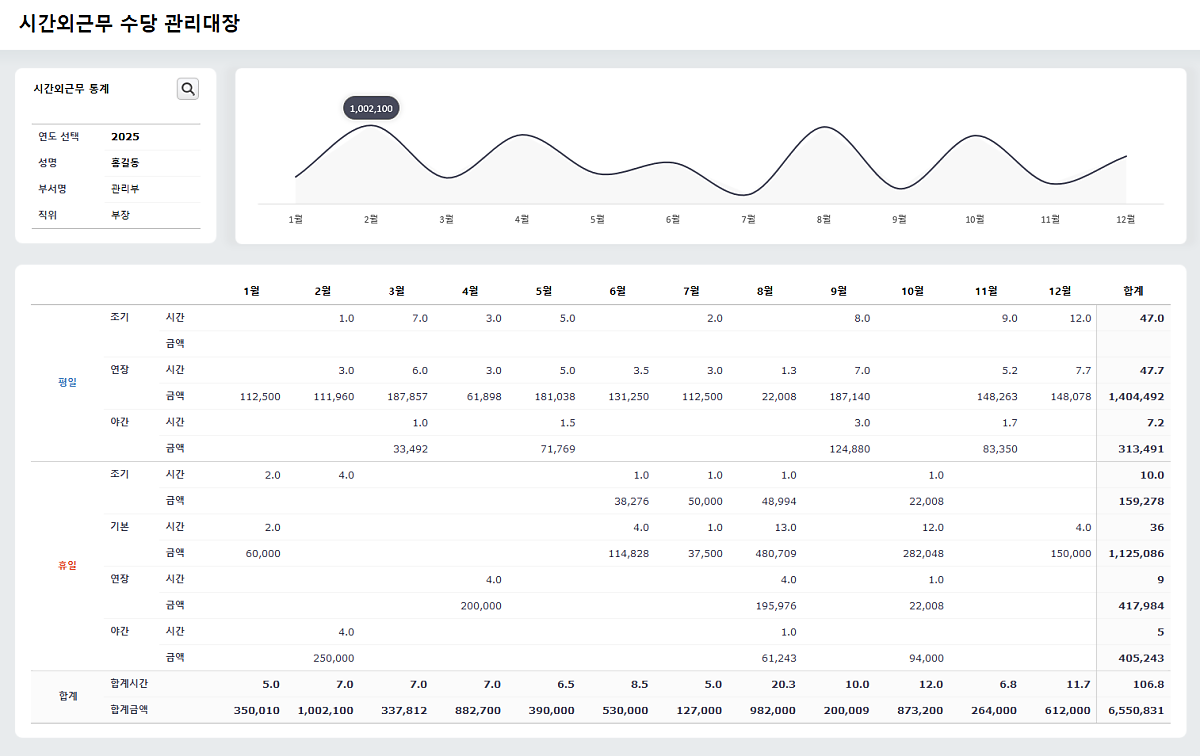 사원별 연간 시간 외 근무 통계와 함께 차트가 제공됩니다.