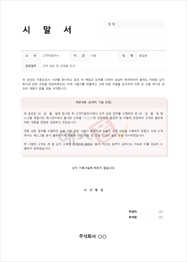 | 시말서 (규정 위반) | 시말서 (전화상담 불량) | 시말서 (상사 지시 불이행) |