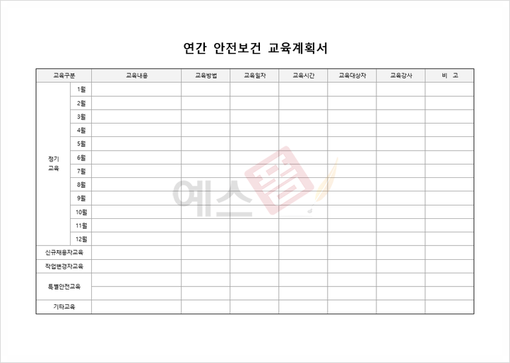 예스폼에서는 안전관리계획서 이외에도 연간 안전보건 교육계획서 양식 역시 제공 중에 있는데요. 해당 양식의 경우 회사에서 한 해의 안전보건 교육계획을 세우기 위해 참고해 보기 좋은 서식으로 교육 구분, 교육내용, 교육 방법 등의 내용으로 구성되어 있는 교육계획서이므로 만일 산업재해예방을 추진하기 위해 각 사업장에서 안전보건관리에 대한 기본적인 사항을 정한 규정 및 계획을 세우고 싶은 사업주 분들이라면 해당 양식을 활용해 보시는 것을 추천드리겠습니다.