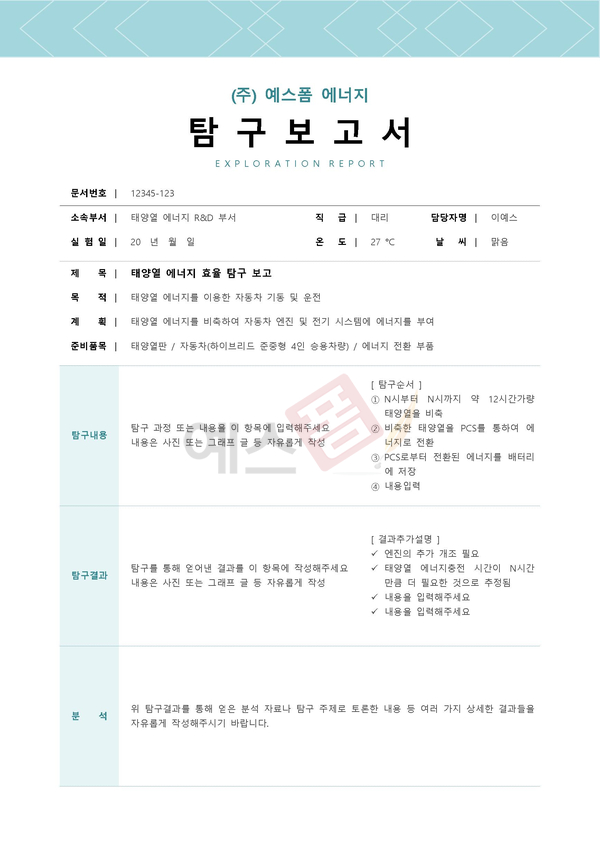 | 프로젝트 결과보고서 | 워크샵 기획안 | 출장보고서 | 탐구보고서 |