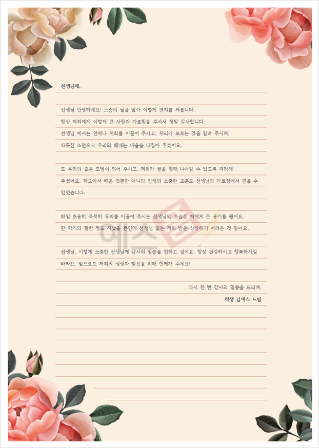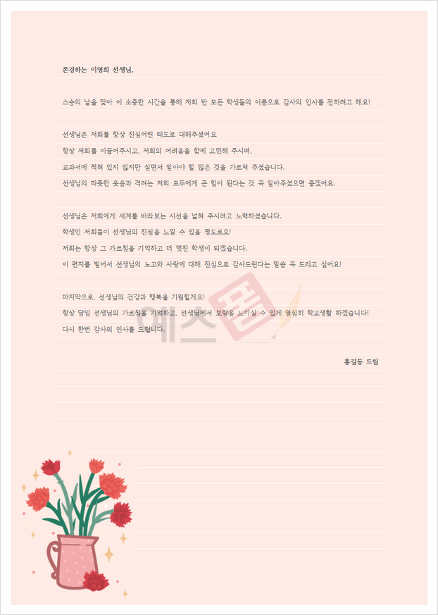 1️⃣ 선생님께, 꽃처럼 아름다운 마음으로 우리를 가르쳐 주셔서 감사합니다. 선생님의 그 따뜻한 마음과 가르침은 학생들의 마음속에 영원히 남을 것입니다. 선생님 덕분에 세상을 바라보는 시각이 넓어졌습니다.