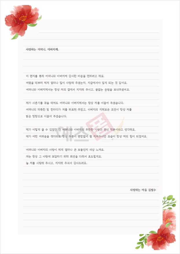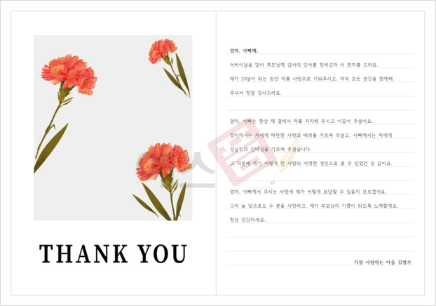 4️⃣ 부모님, 저에게 주신 사랑과 지혜, 그리고 희생은 저의 삶에서 가장 큰 선물입니다. 이 모든 것에 대해 깊은 감사의 마음을 전합니다. 사랑합니다.