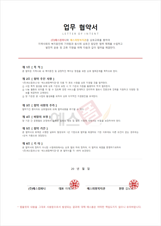 업무협약서 작성 시에는 반드시 업무 협약을 진행하는 목적과 해당 협약의 유효기간, 법적 효력 등의 내용을 반드시 작성해 보는 것이 좋겠습니다.