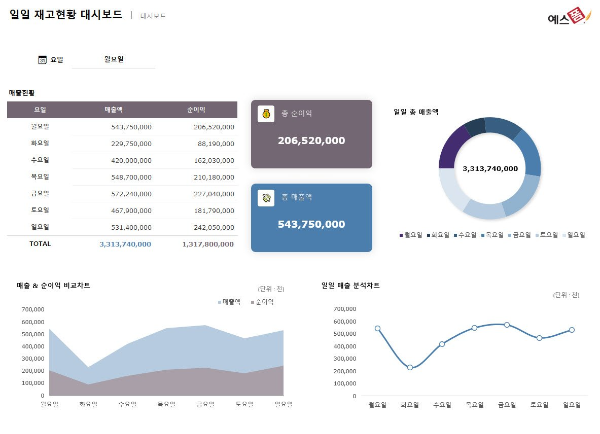요일별 상품 재고 상태를 실시간으로 모니터링하고 관리할 수 있는 일일 재고 현황 대시보드 템플릿입니다.