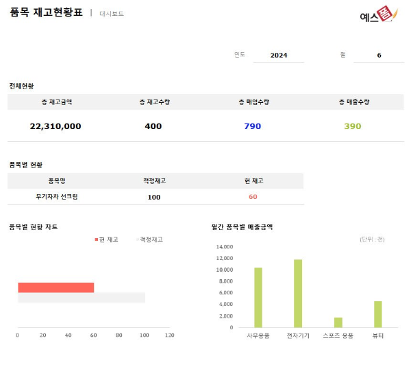 품목 기본 정보 및 매입/매출 내역을 통해 대시보드 차트가 자동 생성되며, 품목별 현황 확인이 가능합니다.