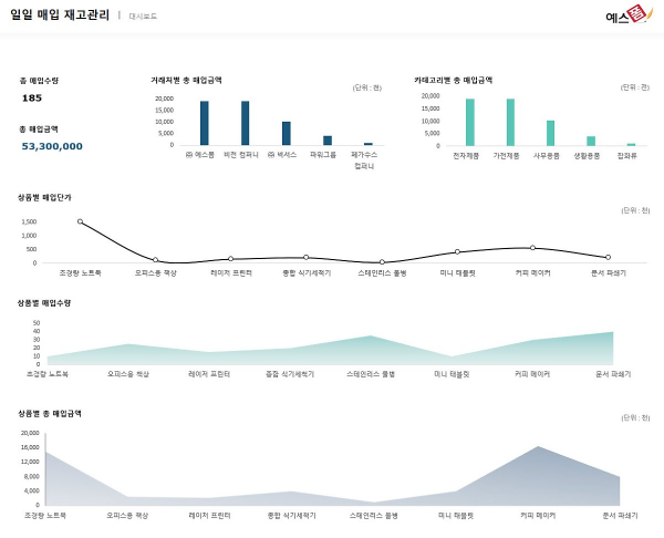 품목별 매입단가와 수량을 입력하면 총금액이 자동계산되며, 이를 바탕으로 대시보드가 자동 생성됩니다.