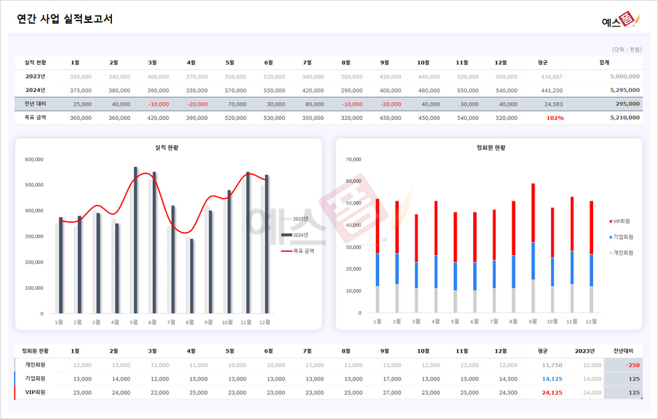 다양한 회원 등급이 있는 기업에서 사용하기 좋은 연간 사업 실적 보고서 양식입니다. 전년도, 금년도, 목표금액에 따른 달성률과 전년대비 증가금액 및 월별 회원 현황을 함께 확인할 수 있습니다. 실적 현황과 회원 현황을 그래프로 나타낼 수 있습니다.