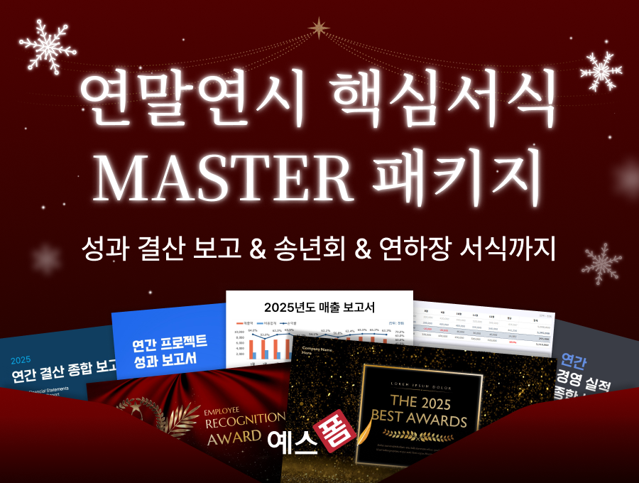 "연말성과보고서는 어떻게 작성해야 할까?", "송년회 양식은 어디서 구하지?", "종무식 공문은 어떤 형식으로 써야 하나?" 고민하시는 분들을 위해 오늘 예스폼에서 연말연시 핵심서식 MASTER 패키지를 소개해드립니다. 송년회, 시상식, 성과보고서 등 연말연시에 꼭 필요한 모든 서식을 한 곳에서 만나보세요!