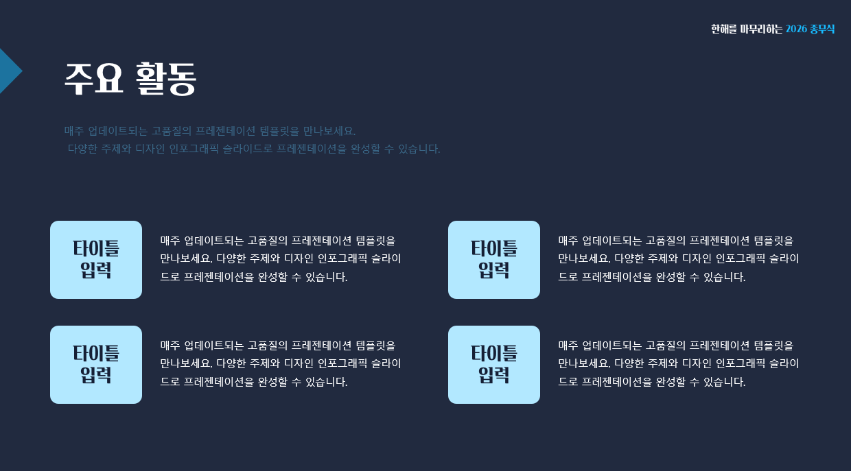 심플하면서도 모던한 디자인을 선호하는 분들을 위한 30페이지 템플릿입니다. 깔끔한 화이트 배경에 블루 포인트 컬러로 구성되어 있어, 목표 달성률과 주요 성과를 명확하게 전달할 수 있습니다. 한 해 동안의 성과와 주요 활동을 정리하며, 성과 전망까지 시각적으로 효과적으로 표현할 수 있도록 다양한 슬라이드를 제공합니다.
