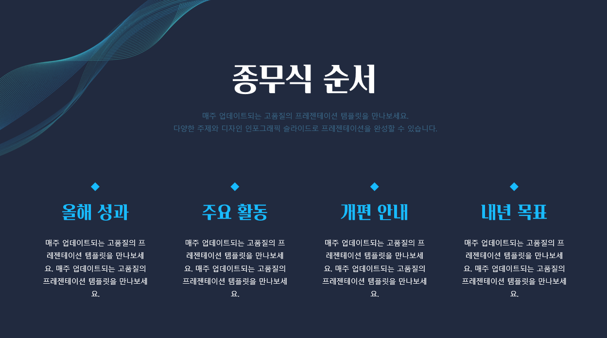 모든 종무식 양식은 개회사, 국민의례, 회사 구호 제창, 경과보고 등의 내용으로 구성되어 있어, 격식 있고 체계적인 종무식을 진행할 수 있도록 도와드립니다.