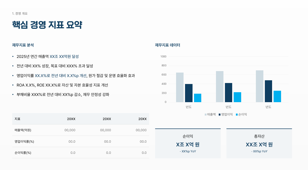경영 개요 → 재무 성과 → 사업 실적 → 시장 분석 → 차년도 전망 순서로 구성하면 논리적인 흐름을 만들 수 있습니다.