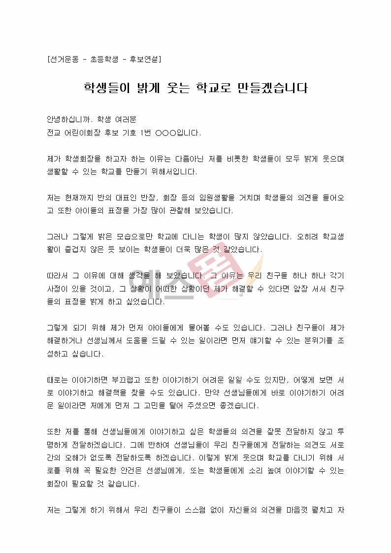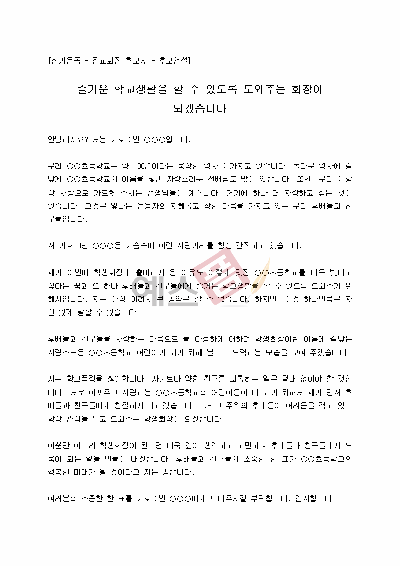 | (후보연설) 전교회장 선거 초등학생 후보자 연설문(밝은 학교) |