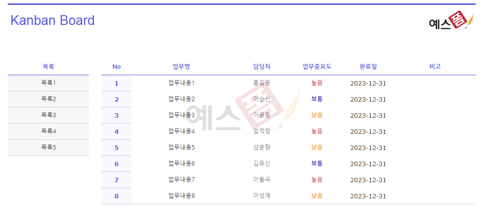 작업을 시각화하여 업무를 효율적으로 관리할 수 있는 칸반보드의 간편형입니다. 목록과 함께 업무 정보를 입력하면 자동으로 칸반카드가 생성되어 칸반보드를 편리하게 관리할 수 있습니다.