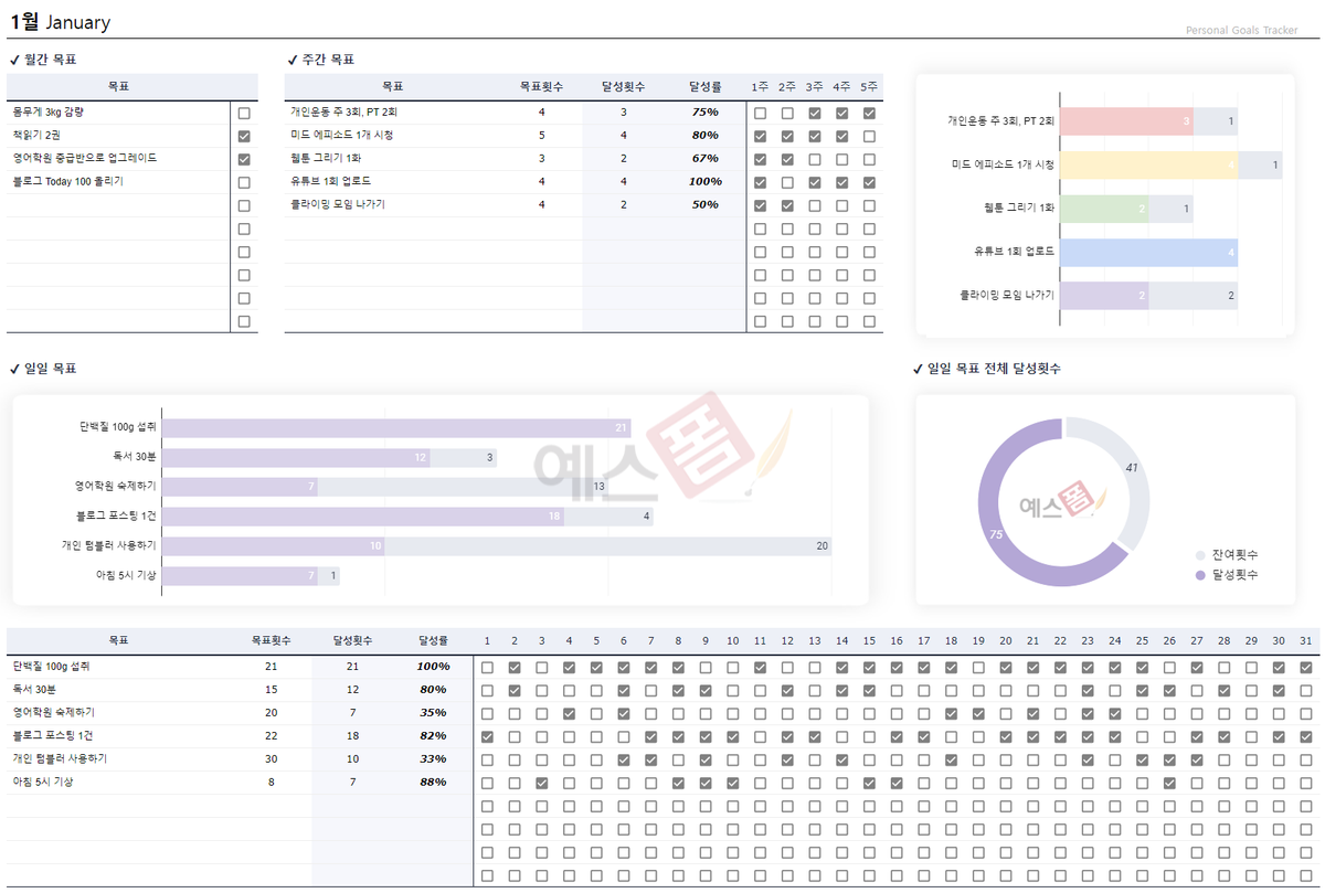 목표는 회사 업무에만 있는 것이 아니죠. 다이어트, 자기계발, 환경보호 등 개인적으로 달성하고 싶은 목표가 있다면, 예스폼의 개인 목표관리 템플릿을 활용해 보세요! 1년 개인 목표관리 템플릿(Personal Goals Tracker) 구글 스프레드시트는 1년간의 개인 목표를 월간 · 주간 · 일일 목표로 나누어 달성 횟수와 달성률 트래킹이 가능하며, 연간 목표를 효율적으로 관리할 수 있습니다👍