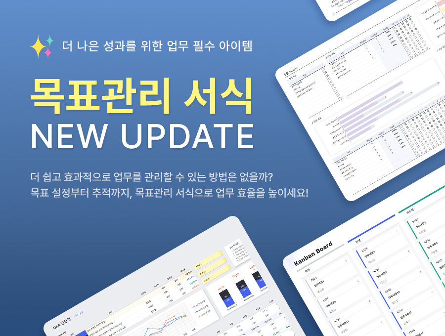 그래서 이러한 목표관리를 좀 더 간편하고 효율적으로 수행하실 수 있도록 예스폼에서 목표관리 서식들을 새롭게 업데이트 하였는데요. OKR, 칸반보드, 개인목표관리 등 오늘 소개해드리는 목표관리 서식들을 활용하셔서 프로젝트 목표 설정부터 추적까지, 업무를 체계적으로 관리해 보시기 바랍니다!