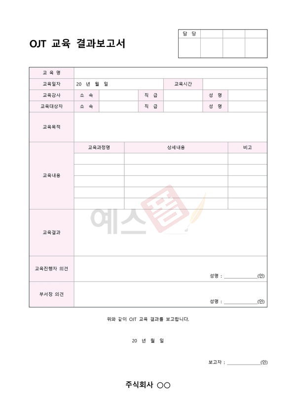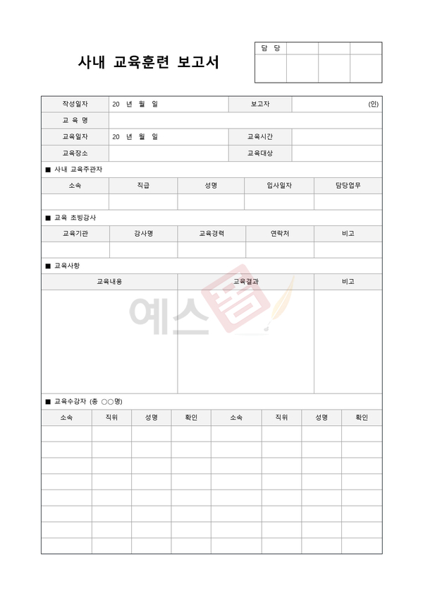 교육내용과 참석자 명단, 교육 진행자 의견 등을 기재하여 교육훈련의 결과를 보고하기 위한 양식입니다.