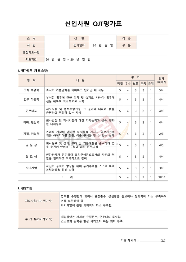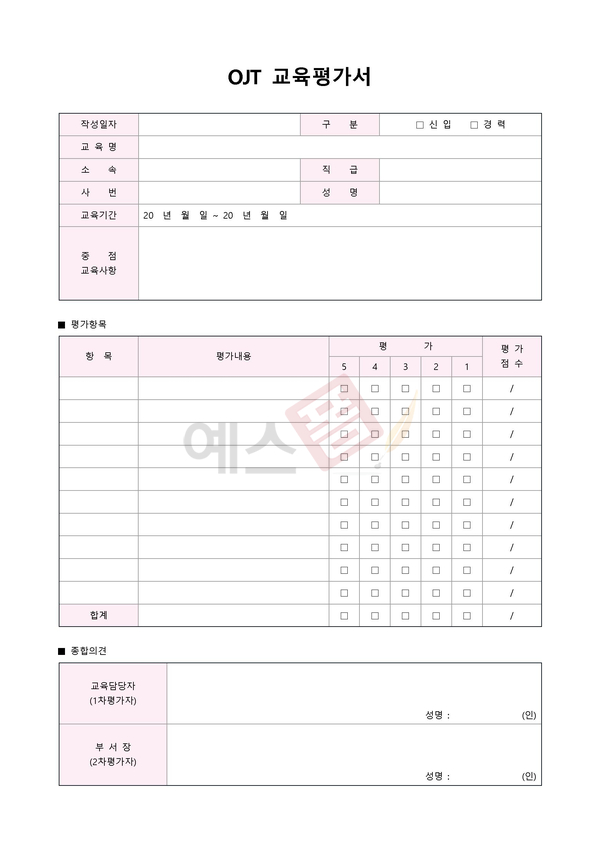 | 교육훈련 성과평가표 (평가결과) | OJT 교육평가서 | 신입사원 OJT 평가표 |