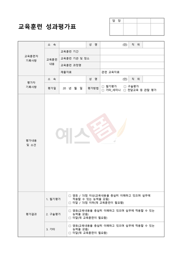 교육훈련을 마치고 교육 내용이나 교육 참여자의 평가내역을 기록하기 위한 양식입니다. 중점 교육사항과 평가항목별 평가내용 및 종합의견을 기재하실 수 있습니다.