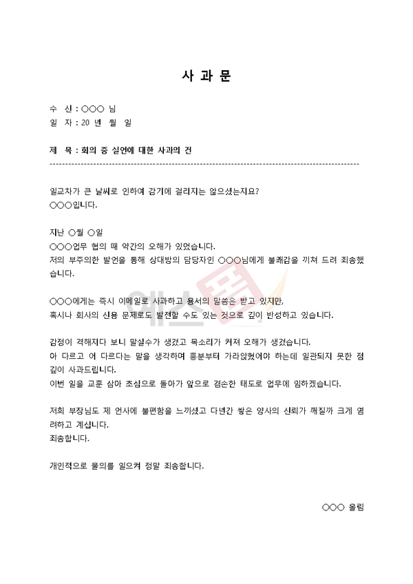 | 지급지연 사과문 | 청구오류 사과문 | 실언에 대한 사과문 |