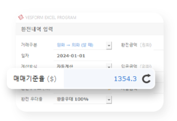 실시간 환율 조회로 매매기준율이 자동 표시되며