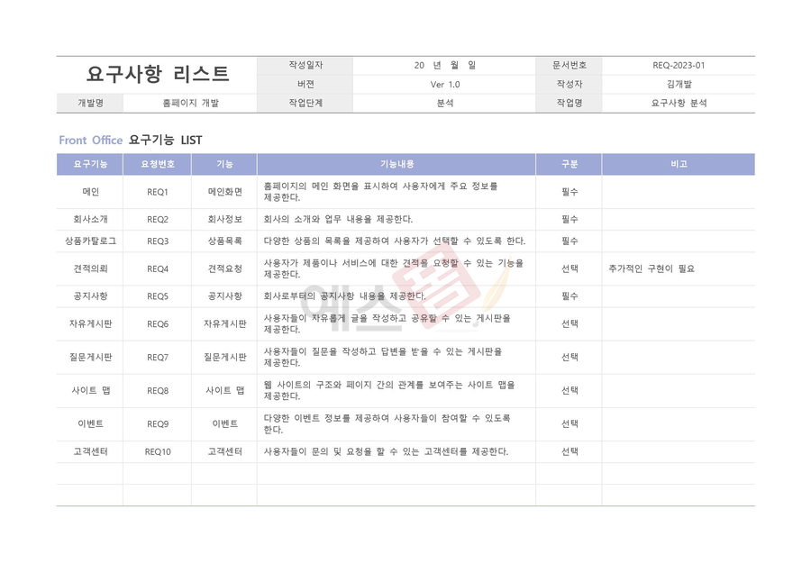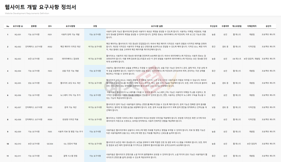 요구사항 ID, 분류, 요구사항명, 요구사항 설명, 우선순위 등 웹사이트 개발 작업에 필요한 요구사항을 정리하실 수 있는 시트입니다.