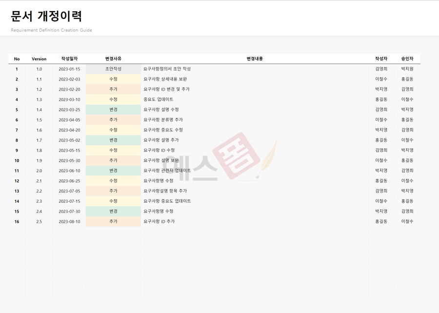 요구사항 정의서 초안을 작성한 이후에 변경, 수정, 추가된 사항을 정리하실 수 있는 시트입니다.