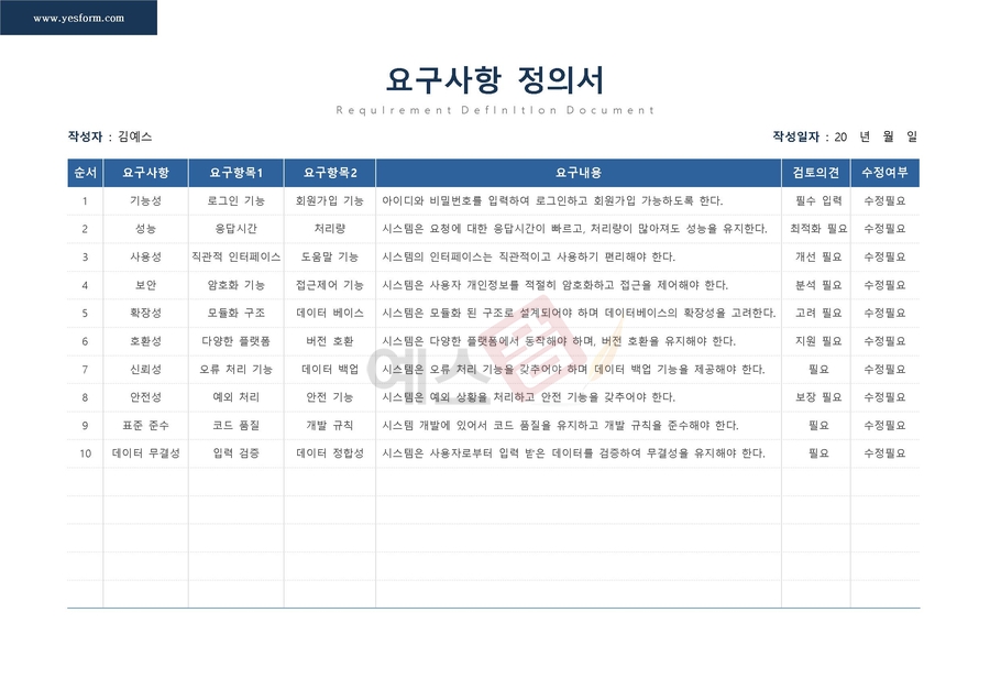 | 비기능적 요구사항 | 시스템의 성능, 안전성, 보안, 사용성, 확장성 등과 같은 품질 속성에 대한 요구사항을 명시합니다. 이러한 요구사항은 기능적인 요구사항 외에도 시스템이 가져야 할 특성과 제약사항을 정의합니다. |