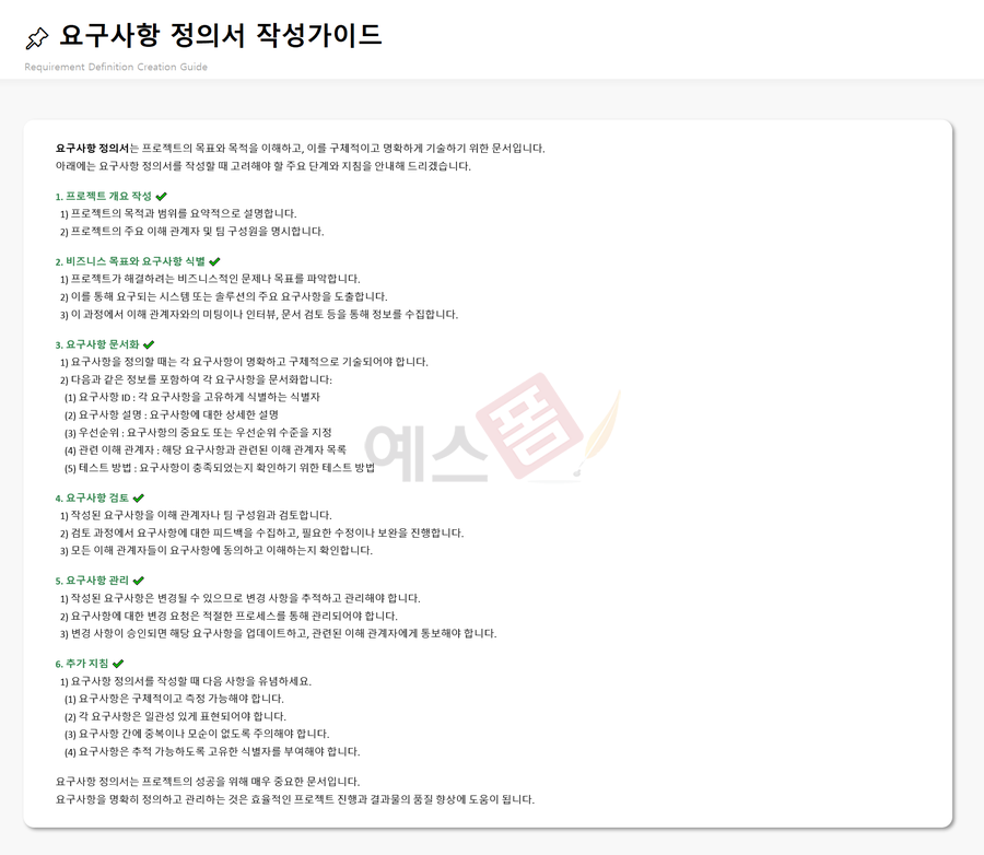 요구사항 정의서를 작성할 때 고려해야 할 주요 단계와 지침을 정리한 시트입니다.