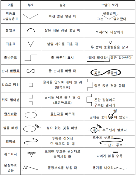 교정부호는 표준화된 부호만 사용하며, 띄움표(띄어써야 할 때), 둠표(붙여써야 할 때), 고침표(틀린 부분에 '∨'표 후 상단에 표기), 지움표(줄 긋기), 넣음표(삽입 시 '-'표 사용) 등을 활용해 정확하게 수정할 수 있습니다.