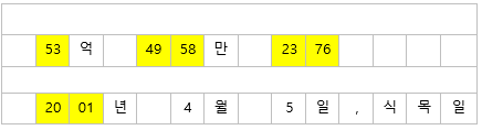 숫자는 만 단위로 끊어서 한 칸에 두 숫자씩 쓰고(예: 12,345 → 12|34|5), 알파벳은 소문자는 한 칸에 두 자씩, 대문자는 한 칸에 한 자씩 작성합니다.