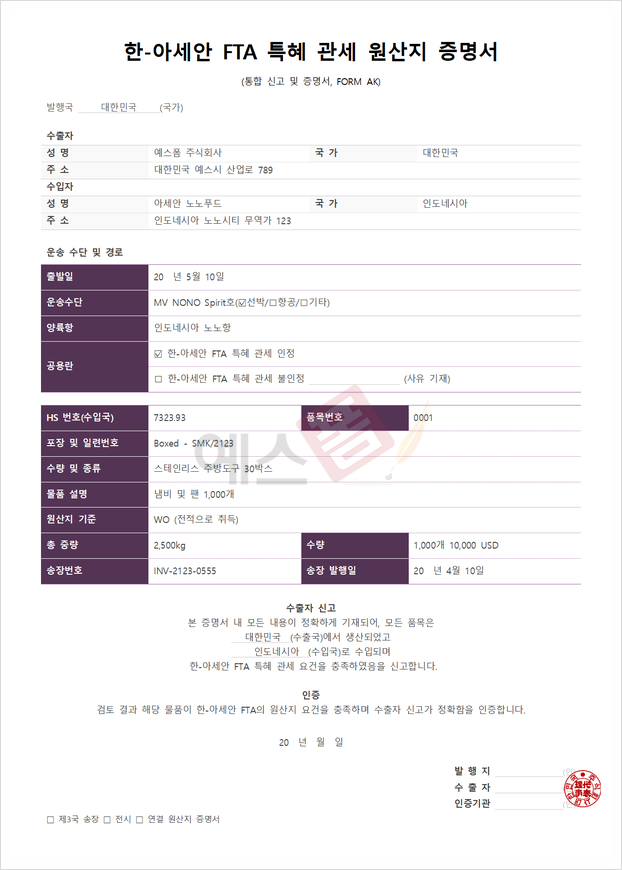 📝 한-아세안 FTA 원산지증명서