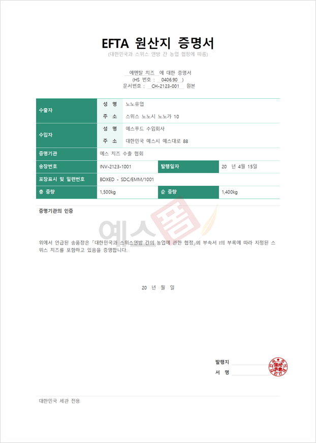 대한민국과 유럽 자유무역 연방 간 FTA 협정에 따라 수출입되는 치즈가 협정 조건을 준수한다는 내용의 EFTA 원산지증명서입니다.