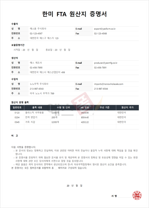 ▼▼ 예스폼 FTA 원산지 증명서 샘플 양식 더 보기 ▼▼