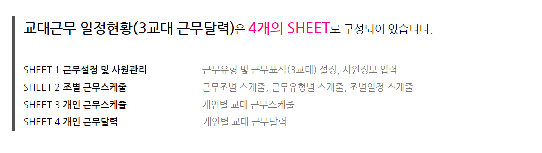 SHEET 04 개인 근무 달력 : 개인별 교대근무 달력 입력이 가능합니다.